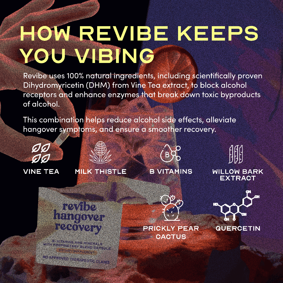 Revibe Party Recovery Pills are a blend of carefully selected natural ingredients formulated to support your body during social events. Take Revibe before or after a fun night out to help you wake up feeling refreshed and ready to go!
