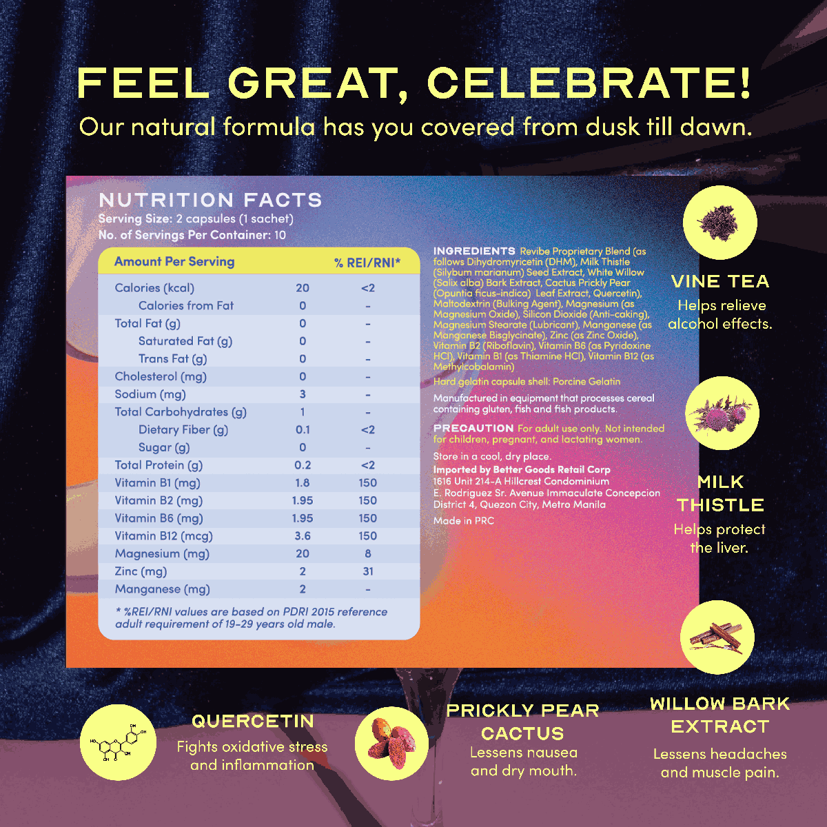 Revibe Party Recovery Pills – Enjoy the Party, Feel Great After! Boost your post-party wellness with Revibe Party Recovery Pills! Made with a blend of natural ingredients, these pills are designed to help you maintain your best self, even after a night out.